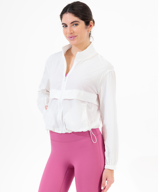 The Tulum jacket is the answer to your layering needs. Lightweight, short and versatile, it has been precisely designed with a full-length front zipper, high collar, side pockets, sleeves with adjustable cuffs and a drawstring at the waist for a more customized fit.